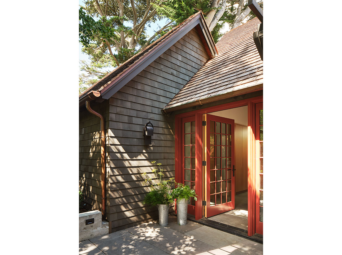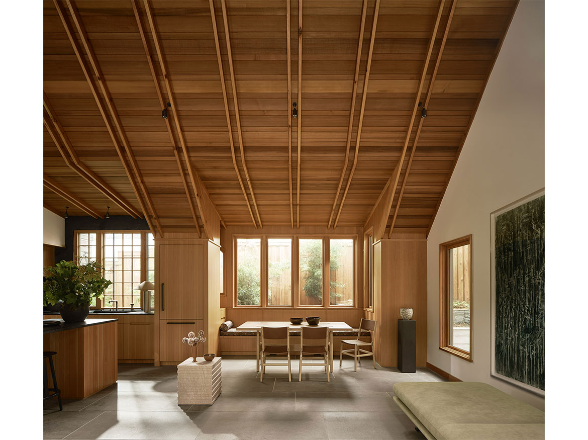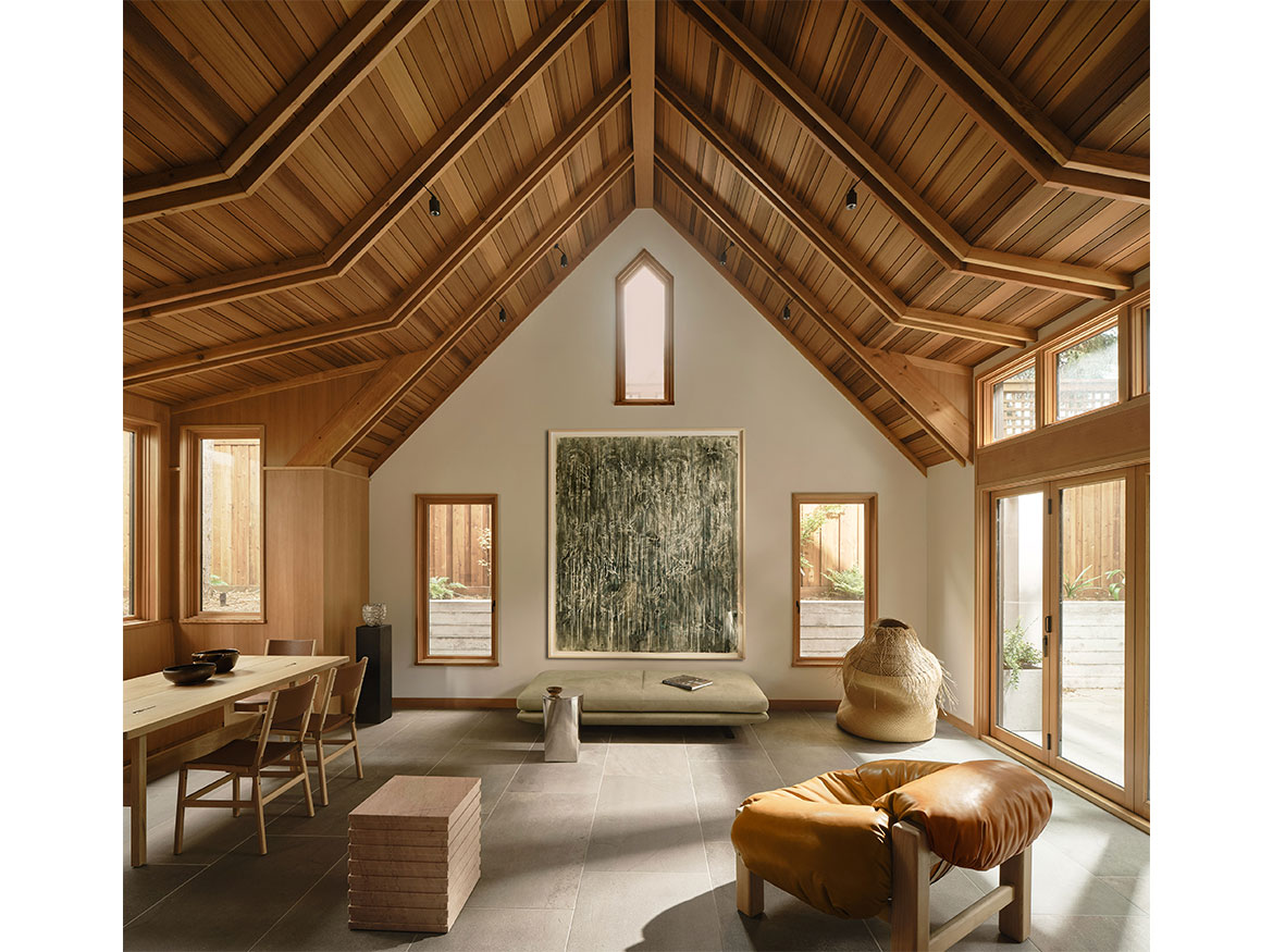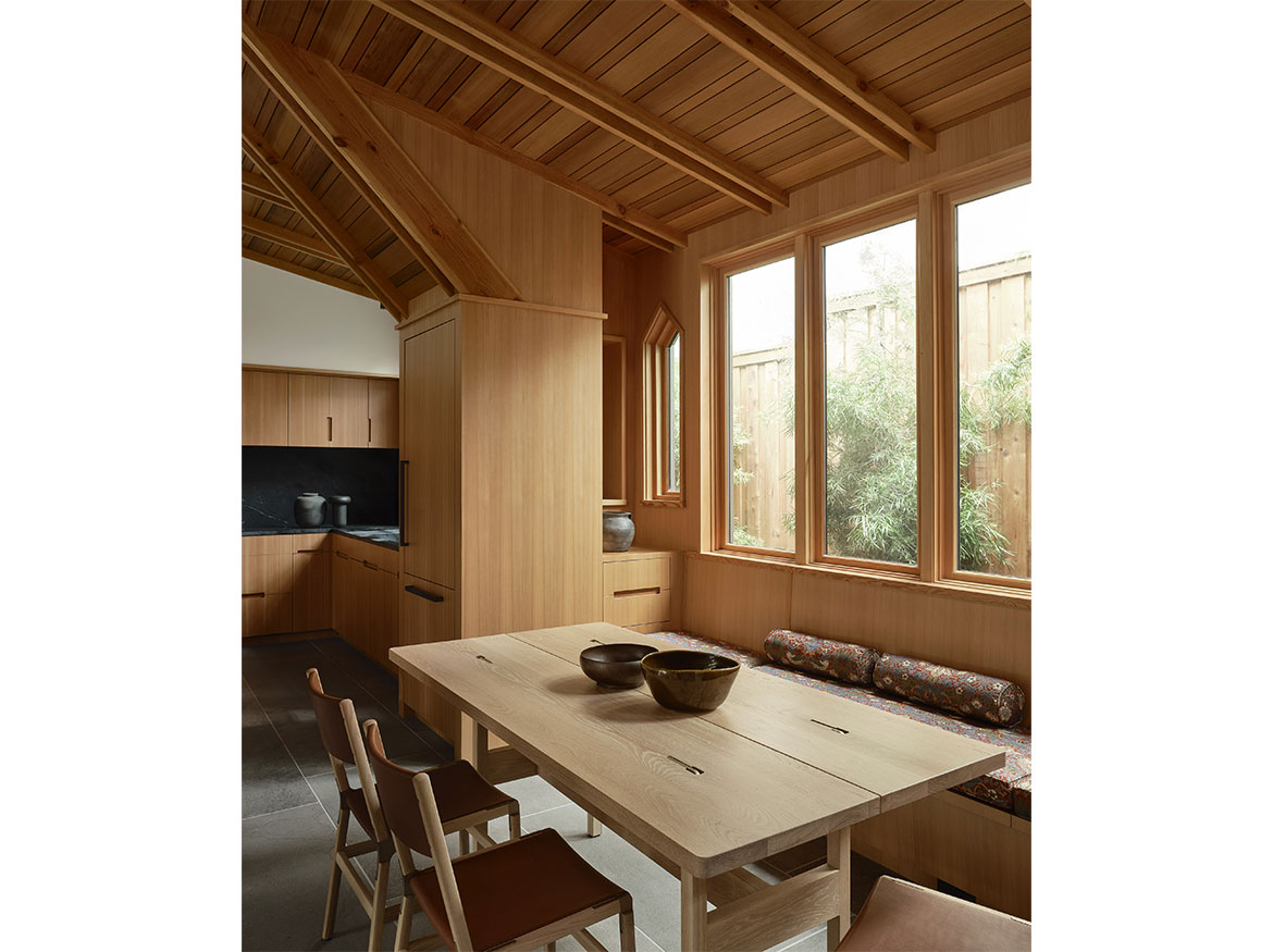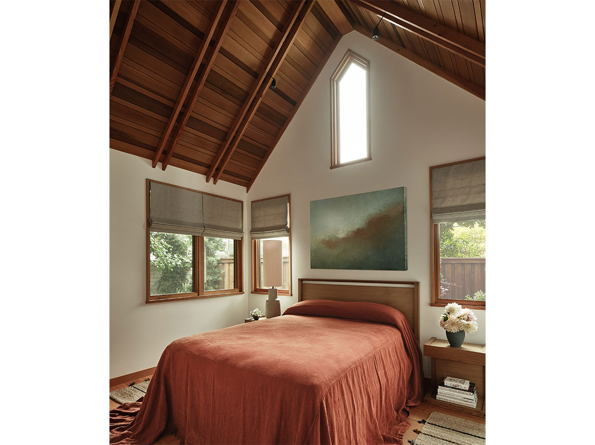 The first permitted free-standing ADU in San Francisco under CA State law. This new wood framed construction, placed in the Rear yard of an historic Maybeck house, began initially as a small wood working shop and ceramic studio. The rigors of the ADU requirements prevailed, and the 2 bedroom ADU is the result. A vaulted Living space with expressed double rafters is designed with a nod toward Maybeck and connects to the adjacent outdoor garden room. The bedroom, also vaulted through slight of hand within the poche of the roof lines, emulates the main space, but on a scale for a bedroom. The skylit bath shares the loftiness of the tall roof lines, which expertly bring natural light into the Bath and circulation spaces. Custom cabinetry in the everyday/approachable material, Douglas Fir, is designed to quietly elevate the coveted storage spaces for daily life. The building design is meant to have the feel of a pre-existing garden shed newly converted to a sweet dwelling structure.