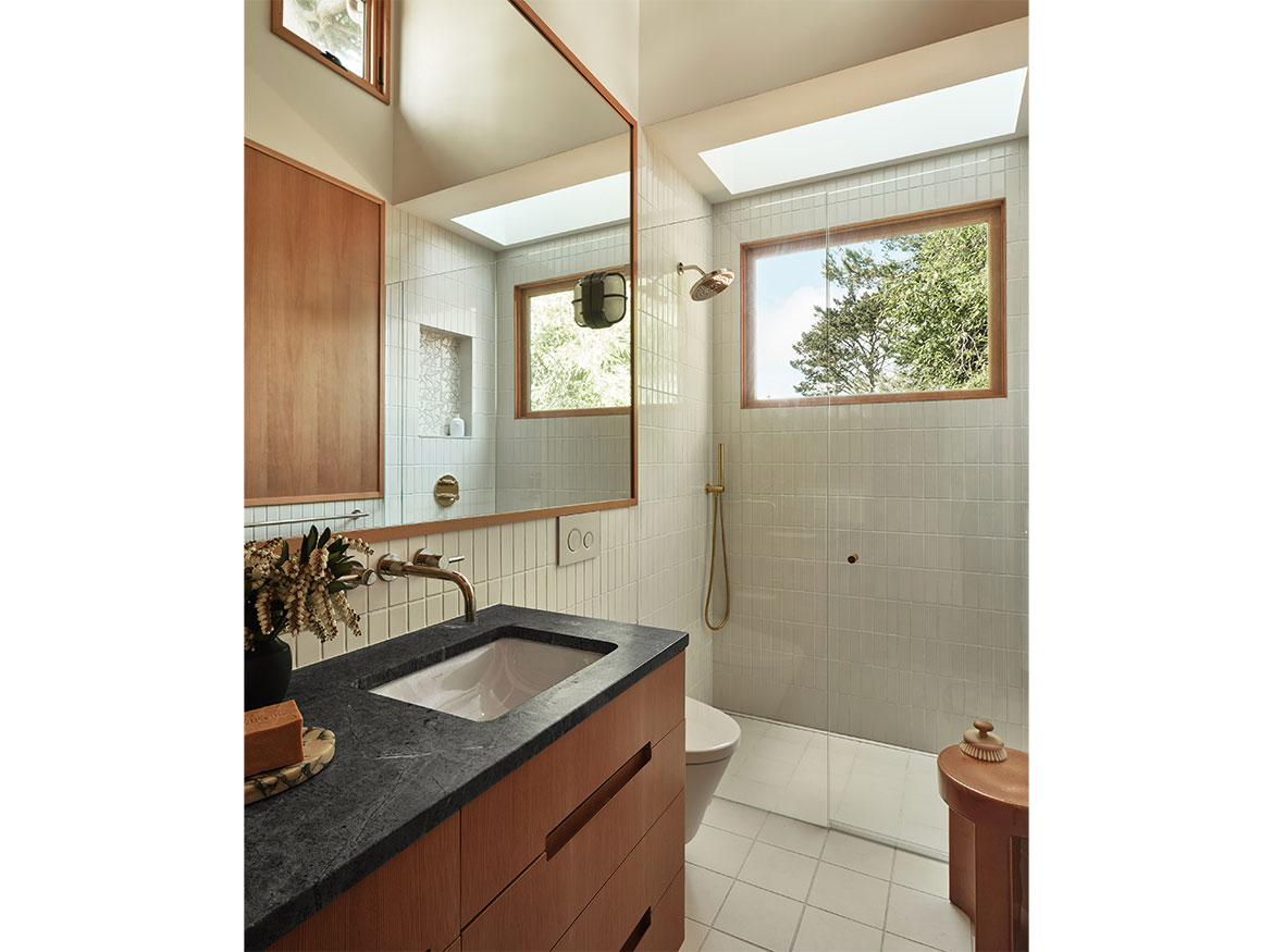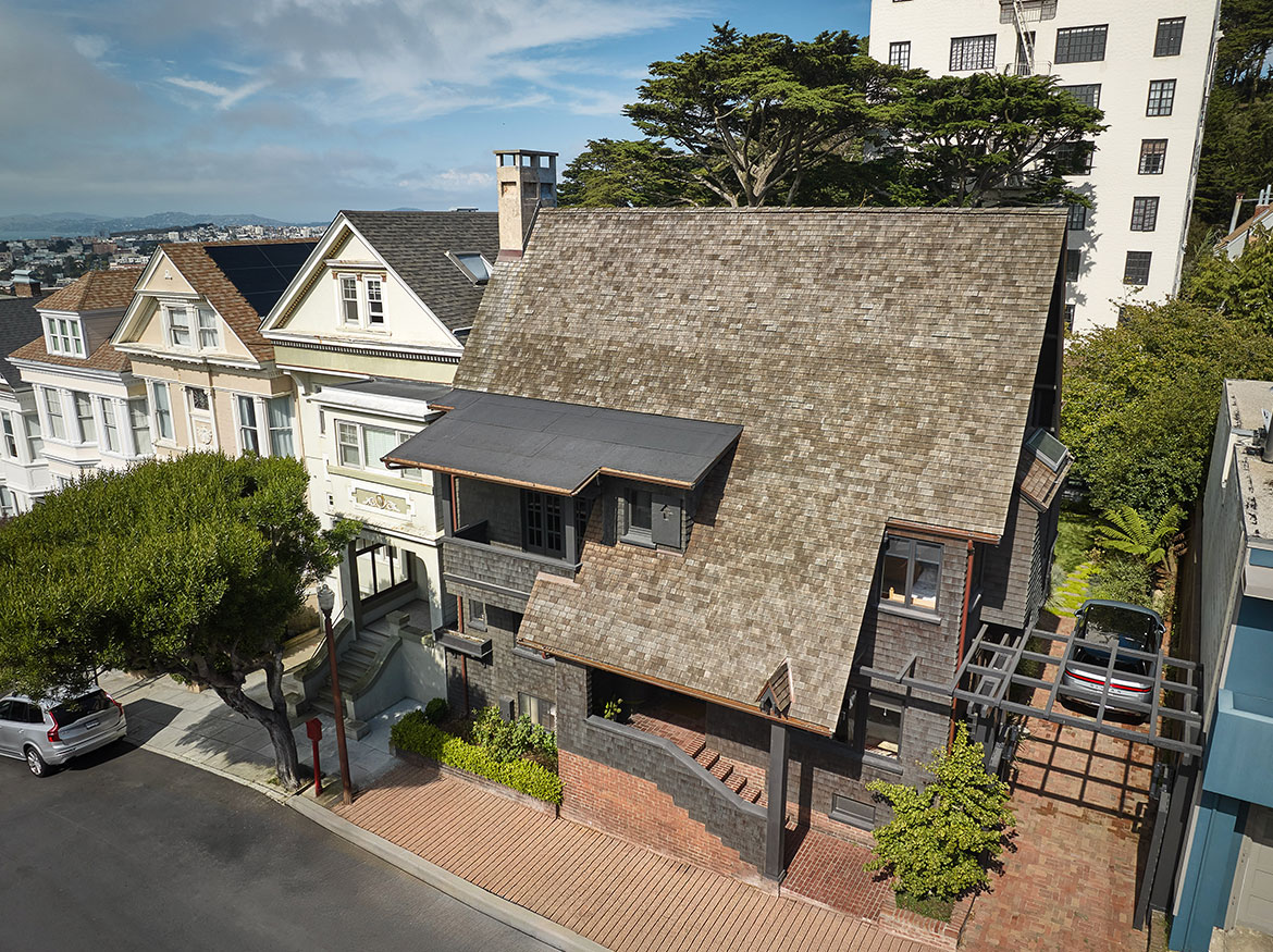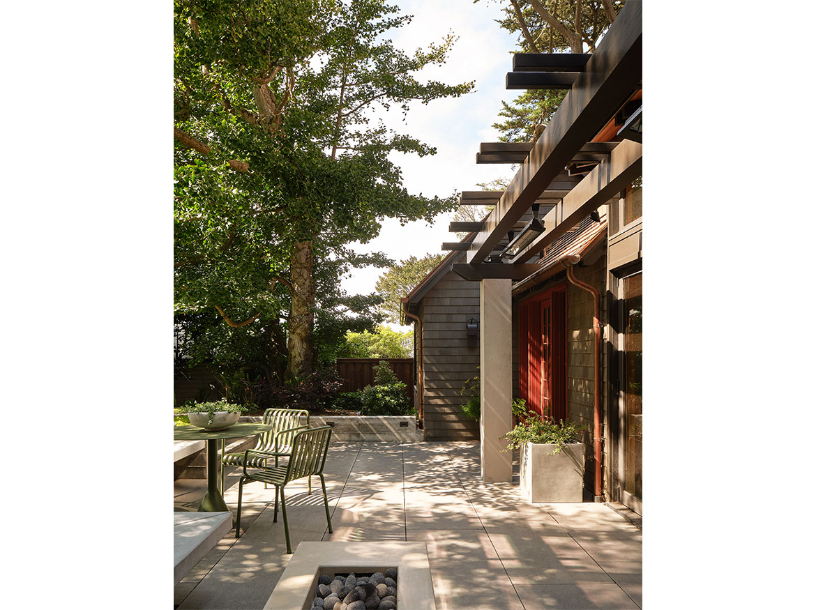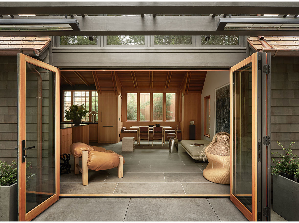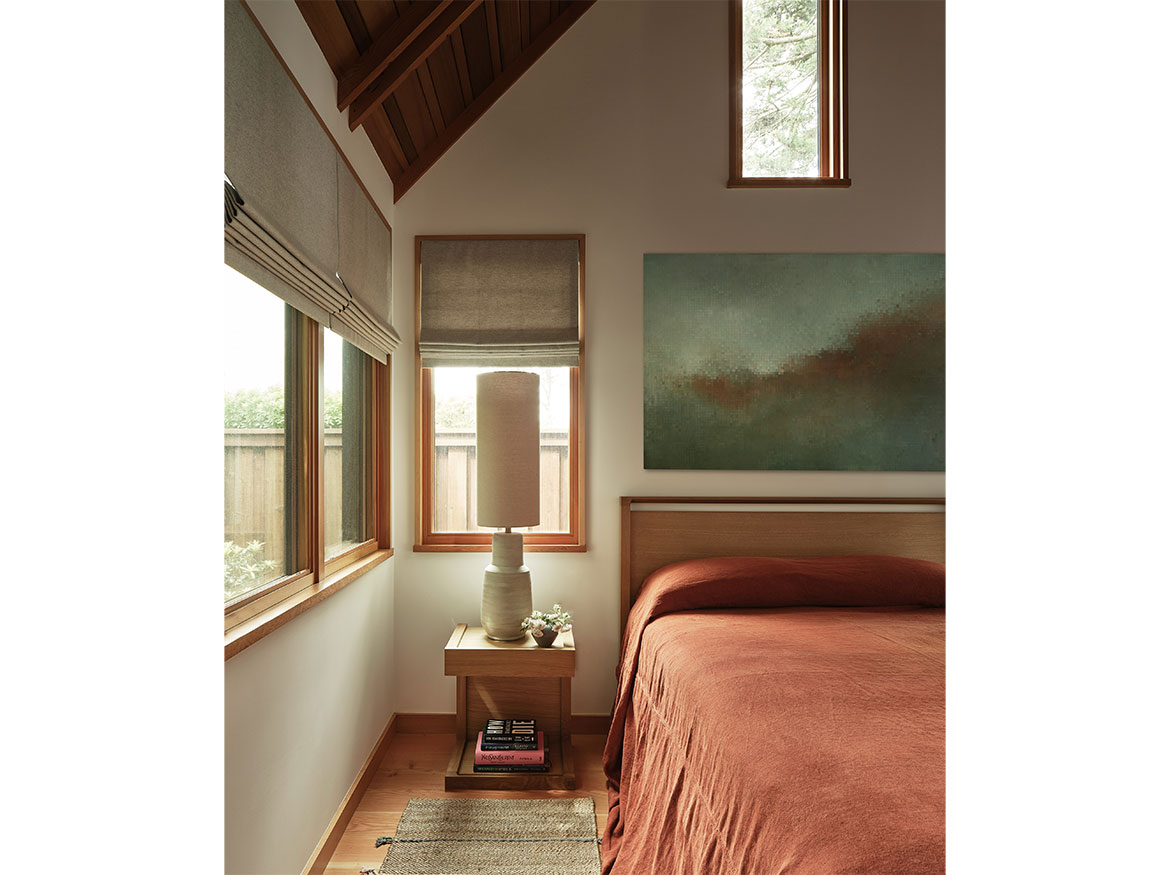 The first permitted free-standing ADU in San Francisco under CA State law. This new wood framed construction, placed in the Rear yard of an historic Maybeck house, began initially as a small wood working shop and ceramic studio. The rigors of the ADU requirements prevailed, and the 2 bedroom ADU is the result. A vaulted Living space with expressed double rafters is designed with a nod toward Maybeck and connects to the adjacent outdoor garden room. The bedroom, also vaulted through slight of hand within the poche of the roof lines, emulates the main space, but on a scale for a bedroom. The skylit bath shares the loftiness of the tall roof lines, which expertly bring natural light into the Bath and circulation spaces. Custom cabinetry in the everyday/approachable material, Douglas Fir, is designed to quietly elevate the coveted storage spaces for daily life. The building design is meant to have the feel of a pre-existing garden shed newly converted to a sweet dwelling structure.